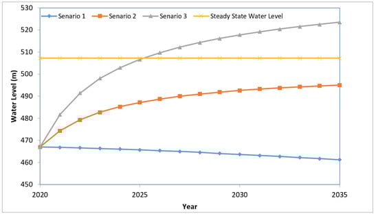 The transient model was used to perform the predictive simulations and the sustainability of the G.W. system. After the transient calibration, three different future prediction scenarios were developed up to the year 2035. The scenarios considered the water level change in the aquifer system as follows:
