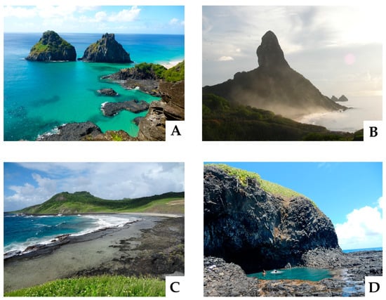 Four geosites of the Fernando de Noronha archipelago. (A) Porcos Bay, considered one of the most beautiful beaches in Brazil. (B) Peak Hill, the highest peak of the archipelago. (C) Caieira’s Cove has agglomerates, ashes, and dikes of the Remédios Formation and blocks and pebbles of the Quixaba Formation. (D) São José natural pool, located in São José Island. Visiting this geosite is only possible when the tide is low.