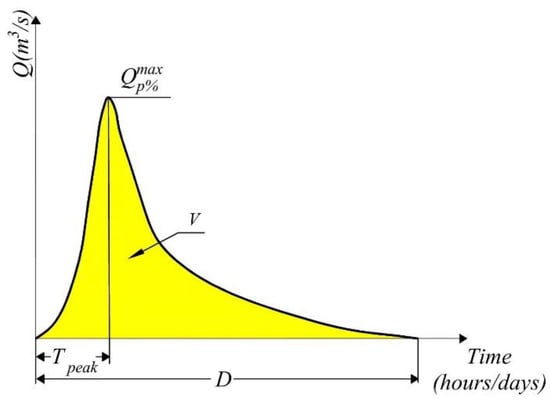 Chuntian et al. [] have introduced, besides the set (peak discharge, flood volume), the temporal parameter of hydrograph peak time. Other authors [,,,] have characterized a flood hydrograph with peak discharge, flood volume, and duration as correlated random variables. Mediero et al. [] have generated a set of synthetic hydrographs that preserve the statistical characteristics of the observed peaks, volumes, and durations, while the hydrograph shape is defined by two variables: the time to peak and the location of the hydrograph centroid.