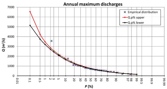 An example of the uncertainty interval for the annual maximum discharges is presented in Figure 2. The presence of an outlier should be noted. The empirical probability for this discharge is about 2.4%, while the theoretical probability of the same value is in the range of 0.5–1%.