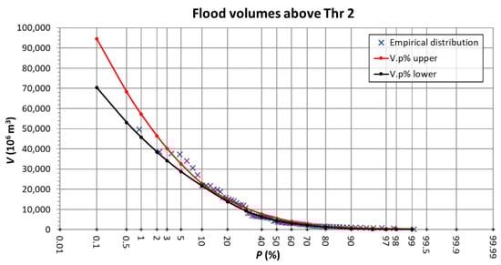 The flood volumes over are statistically processed, resulting in the interval of uncertainty for the volumes , denoted by This means that an infinite number of volumes may correspond to the probability of exceedance (Figure 3).