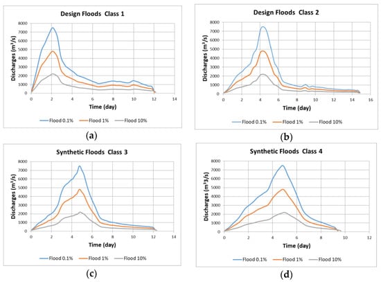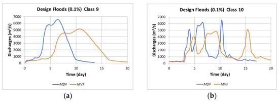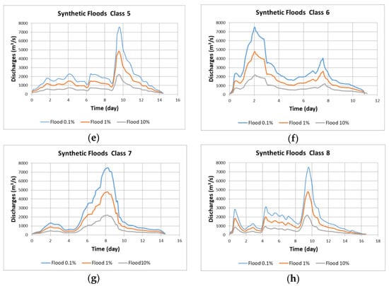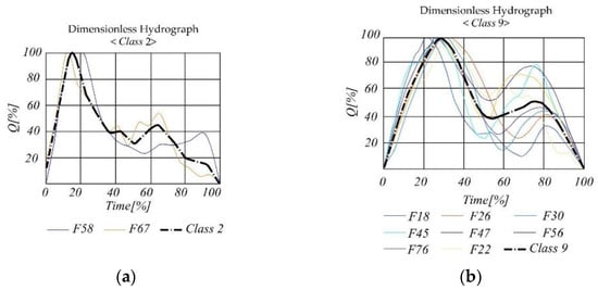As an example (Figure 4a), the average dimensionless flood of Class 2 is the weighted average of dimensionless floods 58 and 67, where the weighting factors are and . The shape of Class 9 is given by the weighted average of 8 floods (Figure 4b).