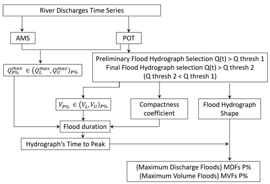 For a selected flood, the flood duration corresponds to discharges > . In this approach, the duration of the selected floods is variable. The volume of interest is given by the integral of the discharges higher than the threshold [], unlike other studies, where the volume is computed for a fixed duration, for example, 7 days [,].