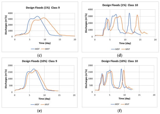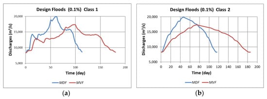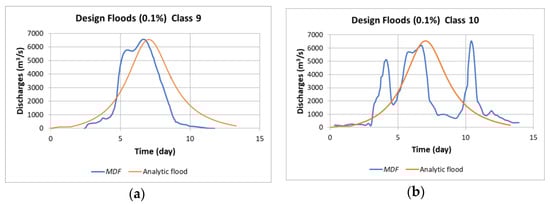 For the present paper, instead of looking for the best distribution function (possibly based on additional criteria []), the uncertainty interval was used to define the lower and upper reasonable limits of the maximum discharges and flood volumes. Considering the uncertainty for maximum discharges and flood volumes, flood hydrographs, which reproduce the shape of remarkable floods that occurred in the past, are obtained. Among the DFs, the most critical (yet plausible) combinations for hazard estimation, namely the Maximum Design Flood (MDF) and the Maximum Volume Flood (MVF), are of special interest. The main advantage of the proposed method is that instead of a unique DF, a set of flood hydrographs, as characterized by the same parameters (maximum discharge, flood volume, and duration) corresponding to the same PE, can be obtained. Hence, the water managers could examine the hydraulic system design and operation under a variety of input hydrographs.