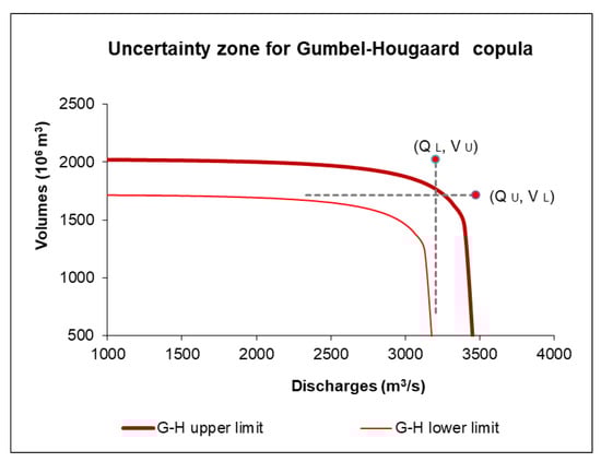 The obtained uncertainty intervals for the maximum discharge and the flood volume, respectively, define a space × in which, theoretically, any point belonging to it represents a possible solution. However, the DF, cannot simultaneously have both the maximum discharge and the volume , where and represent the best estimates of the univariate variables. This point belongs to a hydrograph whose PE is unknown, thus being defined by the common probability of the marginal probabilities of peak and volume []. A high peak discharge does not necessarily mean a high hydrograph volume [] and vice versa.