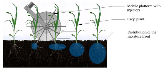 Fresh water is a fundamental element of the natural environment and ensures the continuity of life on Earth [1]. It is estimated that the current annual world water consumption is approximately four thousand km3, 16.7% of which is used by industry, 15.6% is household consumption, and as much as 67.7% is used in agriculture [2]. Therefore, special attention should be paid to the segment related directly to food production [3]. Water consumption in agriculture relates a.o. to the use of irrigation systems, and a measurable effect of their use is an increase in the level of yields [4,5,6]. For this reason, in open field cultivations there is an extensive application of such irrigation systems as mobile or fixed sprinkler systems, which are used globally on an area of approximately 35 million ha [7]. An increasing popularity is also observed in the case of water-saving drip lines, for which the area of use in 2030 will be doubled relative to that of 2000 [8]. Selected features of those irrigation systems became the base point for a concept of an injection irrigation system for crop plants, which is being realized within the framework of the project “Mobile system of injection irrigation and fertilisation meeting the individual requirements of the plant” by the consortium Mobile Irrigation and Fertilisation (MSINiN) [9,10,11]. The concept consists in subsurface application of a specific dose of water, within soil space containing plant root systems, which is characteristic of the subsurface drip line. In addition, the application of water is to proceed in a mobile manner, and that will allow the use of the system on the largest possible area, which is an advantage of mobile sprinkler irrigation systems (Figure 1) [12]. According to this idea, a one-time injection for one plant should last several seconds at maximum. Such an approach to irrigation is in conformance with the idea and solutions of “precision agriculture” [13,14]. One of the issues that should be addressed during the research and development work on this concept is to determine the form of the body of moisture that is formed during pointwise application of water to soil under high pressure of the liquid.