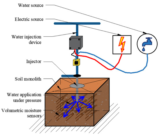 The fundamental difference between the process of injection irrigation and the irrigation systems used so far is the method of water application and the dynamic of an increase of soil moisture within the root system of the crop plant. In the case of the conventional methods of irrigation, the phenomenon of moisture dynamics can be defined as water movement within the aeration zone, caused primarily by the heterogeneity of the sum of gravity potential and pressure equivalent of soil water potential. The gravity potential is related with the effect of gravity on water, while the pressure equivalent is defined by the difference between pressure in water and the atmospheric pressure in the environment of the water particle (so-called matrix or pressure potential) [15,16]. The unique concept of injection irrigation relates to the case when a dose of water is applied to soil in the conditions of a high hydraulic pressure (at the intensity of several hundreds of cm3 of water within a few seconds). Therefore, the dynamics of volumetric moisture in the soil monolith is not determined by the gravity gradient and the pressure equivalent, but solely by the hydraulic pressure of the injected liquid [17]. After the process of injection, the hydraulic pressure disappears and water movement takes place as a result of the difference in the total potential composed mainly of the gravity potential and the pressure equivalent.