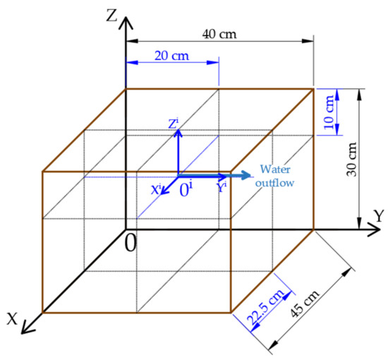 The above assumptions, however, are not sufficient in the case of water injection under high pressure, where the outflow of water is aimed in any horizontal direction. It is then necessary to take into account the point of insertion of the injector nozzle and also the orientation and sense of injection. The adopted solution was determined in reference to the space presented in Figure 3. In the analysed space there is a point 0, which is the origin of the XYZ system, and point 0i—the origin of the XiYiZi system, which is the location of the tip of the injector nozzle oriented along the 0Yi axis. The fundamental condition is that the moisture sensors cover the entire space XYZ, dividing it into equal elementary volumes. Thus, the space was divided into 5 cm cubes. This creates the possibility of analysing the volumetric moisture in every direction (not only in directions 0iXi, 0iYi, and 0iZi), and also allows the construction of water balance which verifies the correctness of the adopted method. In relation to the above, in the experiment conducted within the scope of this study the LP/ms sensors were distributed in a regular grid. The adopted solution can be compared to the grid of the calculation area in the finite difference method. It is a numerical method used for the solution of differential equations [63], such as the Richards equation, used for the description of soil water movement [64].