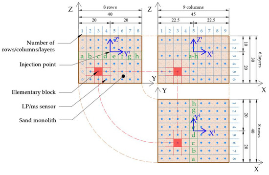 Schematic of the sensor distribution within the physical model and the division of the sand monolith into columns, rows, and layers. Dimensions in centimetres.