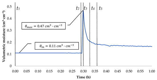 The dynamics of volumetric moisture in an elementary volume in the case of injection of 1500 cm3 of water is presented in Figure 5. This is the dynamics of moisture for a point which is 2.5 cm distant from the injector nozzle and which is situated in accordance with the orientation and sense of injection. In other words, this is the first encountered moisture sensor on the path of the water outflow from the injector nozzle. Prior to the start of water application under pressure, in a 30-min period lasting from moment t1 to t2, the volumetric moisture was constant at = 0.11 cm3∙cm−3. In the period from moment t2 to t3, lasting for 12 s, the injector delivered to the physical model 1500 cm3 of water under high pressure. This caused a jump increase of volumetric moisture, from = 0.11 cm3∙cm−3 to = 0.47 cm3∙cm−3. The mean rate of moisture increase was as much as 18 cm3∙cm−3∙min−1. Such an intensive increase of volumetric moisture is not observed in the case of other irrigation systems. As an example, Mmolawa and Or [74] studied the changes in water content in soil during the operation of a surface drip line. For a point situated 5 cm beneath the emitter, an increase of moisture from 0.25 cm3∙cm−3 to 0.42 cm3∙cm−3 was noted. That moisture increase was observed as late as after about 3 h (the intensity of water outflow from the emitter was 1.6 L∙h−1). To elucidate such a jump in soil moisture, we need to reach for the theory of soil water movement. Water movement in soil is due to differences in the total potential which is the sum of the matrix, gravity, osmotic, and pressure potentials [16]. In the course of injection, the cause of the jump increase of moisture is the gradient of the pressure potential resulting from the pressure of the liquid applied. The remaining gradients can be left out. However, this is a hypothesis which needs to be verified. The maximum measured volumetric moisture of = 0.47 cm3∙cm−3 is higher than the value of = 0.425 cm3∙cm−3 defined as moisture at the state of full saturation in the case of sand [65]. This is evidence of a disturbance of the structure of the porous medium, caused by the high pressure of liquid from the injector nozzle. This is supported by the fact that during injection the surface of the monolith building the model became deformed—the surface in the area of the fixed injector moved up. In addition, after the injection was completed, the surface settled down. The observed phenomenon of ground settlement is a known process which takes place at the moment of saturation of pores with water to the level of and subsequent decrease of volumetric moisture [75]. The period from moment t3 to t4, lasting for 3 min, is a period of rapid decrease of moisture. During that time the volumetric moisture dropped from 0.47 cm3∙cm−3 to 0.22 cm3∙cm−3, i.e., by 0.25 cm3∙cm−3, at an average rate of 0.083 cm3∙cm−3∙min−1. Therefore, the rate of volumetric moisture decrease in that stage is over 20-fold lower than the rate of moisture increase in the period from moment t2 to t3. In the next 3-min period, from moment t4 to t5, the rate of moisture decrease is lower still and amounts to only 0.007 cm3∙cm−3∙min−1. The process of slow decrease of volumetric moisture lasts till the end of the experiment (12 h), and it is now caused by a difference of total potential which is the sum of the gravity potential and the pressure equivalent [15].