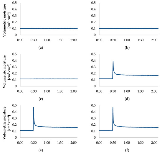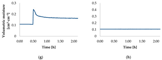 When conducting experiments, apart from the choice of the type of sensors, one should also determine the optimal frequency of observations. The process of injection irrigation is dynamic in character. It was determined that the application of the dose of 1000 cm3 of water to the soil profile lasts about 7 s. In addition, the filtration coefficient of sand is in the range from 10−6 to 10−3 m∙s−1 [56]. For this reason it was decided that the measurements would be taken at the highest possible frequency for apparatus calibrated for those parameters, i.e., at 30-s intervals.