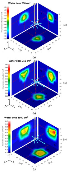 Figure 7 presents volumetric moisture distributions in two vertical planes, perpendicular to each other, containing axes 0Xi and 0Yi, and in a horizontal plane containing axis 0Zi. The visualisations have been prepared on the basis of data from measurements taken at the moment of injection termination (t3). Based on the visualisations of the shape and extent of the moisture front in the figure below, one can conclude that the range of changes of the volumetric moisture is proportional to the volume of the applied water doses. As an example, in the case of the injection of 250 cm3 of water, the maximum volumetric moisture was noted at 3.5 cm from the injector nozzle and it amounted to 0.47 cm3∙cm−3. In turn, for the dose of 1500 cm3, the maximum moisture was as high as 0.65 cm3∙cm−3 and it was recorded at the distance of 12.8 cm from the injector nozzle. The recorded maximum moisture content was higher than the initial porosity of the monolith due to the disturbance of the porous structure by the water jet injected at high pressure. In every case, the maximum values of moisture at the moment of injection were noted in the direction of water outflow from the injector nozzle. The proportion between the intensity of changes in water content and the volume of water applied to the monolith is visible also in the analysis of the dynamics of moisture caused by the operation of other irrigation systems. An example can be the spatial reach of moisture changes in the case of irrigation with the use of a subsurface drip line [76]. When the water dose applied to the soil profile was 1 dm3, the front of soil moisture with the value of 0.33 cm3∙cm−3, in the horizontal direction, could have the reach of 6.7 cm, while for the dose of 5 dm3 it was as much as 16 cm, and for 10 dm3—even 21 cm. In the cited study, the determination of soil moisture dynamics was conducted with the use of TDR probes. Numerical models (Hydrus software) also confirm that in a sandy soil formation the spatial extent of changes in volumetric moisture depends on the volume of water supplied to the porous medium [77].