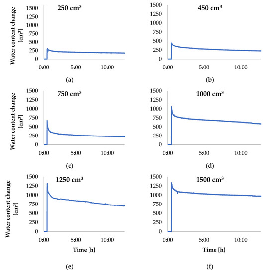 The results of measurements of volumetric moisture provide a basis for the calculation of the water balance in the physical model. Each TDR sensor is representative of an elementary volume—a cube with the side of 5 cm. The sum of water volumes in the cubes is the volume of water in the entire physical model (formula 3). The initial half-hour of the measurements was the period before injection, during which no moisture changes were observed. In the course of the series of experiments, after the 30-min period, water injection took place. The effect was a jump increase of water content in the monolith—. The value of increased with an increase in the injection dose (Table 1). As an example, in the case of the application of 450 cm3 of water the increase was 435 cm3, and for the dose of 1250 cm3–1200 cm3. The increments should be comparable with the volumes of water planned for injection—. However, according to the instructions from the manufacturer of the water injection device, the accuracy of the liquid dose applied is ± 10% [43].