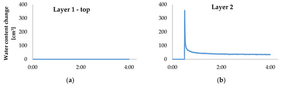 The base and the side walls of the structure of the experimental setup were impermeable barriers, and the upper surface was exposed to contact with atmospheric air (Figure 2). Therefore, the first possible explanation for the decrease of water content is the appearance of the phenomenon of evaporation [37]. However, the partial results of the water balance presented in Figure 9 contradict this hypothesis. The graphs illustrate the changes in water content in division of the monolith into layers. The highest positioned first layer did not show any changes in this respect, both before and after water injection. This means that no process of evaporation took place. In fact, it could not, even if only due to the phenomenon of capillary rise in porous material of this type. In sands, the value of capillary rise after 12 h is only approximately 1.1 cm [78]. In layers 2, 3, and 4 the content of water increased within several seconds—by 266, 251, 120 cm3, respectively—but after 4 h there was a decrease of water content, by 232, 218, and 98 cm3, respectively. This indicates a nearly total evacuation of water from those volumes. In layer 5 no major changes were recorded in water content. Whereas, in the deepest situated, 6th layer, an increase of water content was noted, but it was much less violent than in the higher parts of the sand profile. Within 8 min the increase amounted to 200 cm3. What is more, the subsequent decrease of water content was very slight. After 4 h a decrease by 22 cm3 was noted. Changes of water content over time, but in a division into columns and rows, were also analysed. Changes in water content were noted only in the central rows and columns, i.e., in the immediate vicinity of the point of injection. The run of the changes can be compared to the moisture dynamics noted in layers 2, 3, and 4. In the extreme rows and columns no changes in water content were observed. This indicates that there was no water escape through the extreme vertical barriers of the monolith.