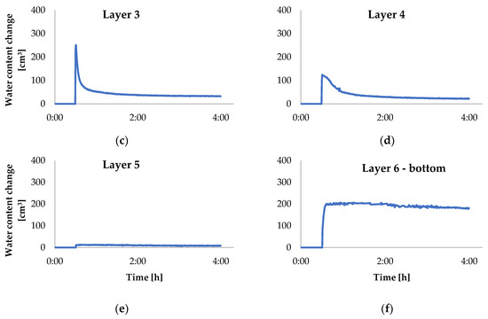 Changes of water content in sand monolith during the injection of 750 cm3 of water, in a 4-h time interval, in the individual layers: (a)—layer 1, (b)—layer 2, (c)—layer 3, (d)—layer 4, (e)—layer 5, (f)—layer 6. The layers were presented in Figure 4.