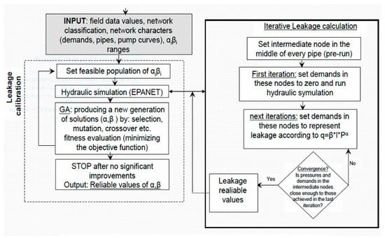 However, a functional relation between α, β and the pipe characteristics has not been found. Hence, a leakage calibration compared with field data is needed to find possible values of α and β [25]. The calibration model uses an optimization technique with genetic algorithm (GA) in order to find appropriate values of α and β. The pipes in the network are classified into groups (according to the pipe material), and objective function (Equation (2)) should be minimized: