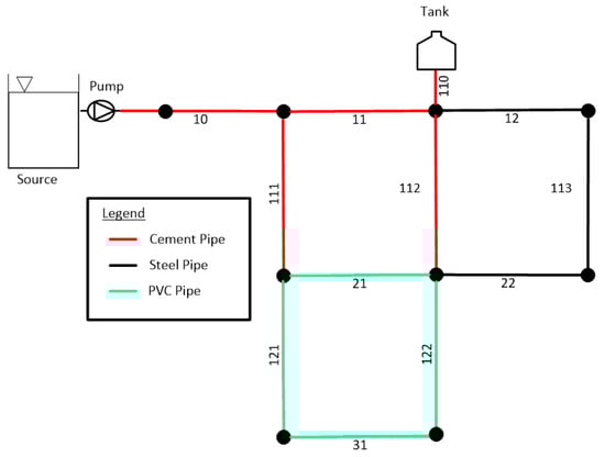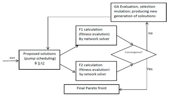 The considerable improvement in simulating hydraulic and water quality phenomena in water distribution systems once EPANET [1] was introduced, along with the computational increase in efficiency and tools, allowed the extensions of optimal hydraulic problems to incorporate water quality issues [2,3], leakage [4,5], and reliability [6]. The most common algorithm involved in solving these problems is a genetic algorithm (GA) [7]. The GA (heuristic search that mimics the process of natural selection) enables the inclusion of pumps, control valves, consumer demands, storage, and other aspects for the overall design/operation of water distribution systems.