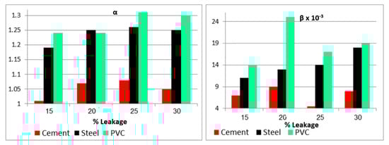 Figure 5 shows the values of and after sensitivity analysis for different leakage scenarios between 15–30% (meaning that other dummy experimental data is given and the pipes are different from the base run). The and values were found to be lowest for cement pipes and highest for the PVC pipes. Interestingly, no definite relationship was obtained between the leakage parameters and % leakage from Figure 5.