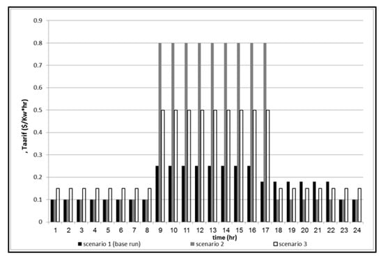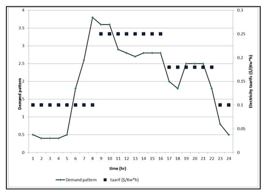 The results in Table 2 will be used as reference results, and will be considered as known and constant values in the optimization process described in Figure 2. In order to generate a conflict between the leakage and energy cost, the demand pattern has been changed significantly (the multiplier of the base demand was increased). The energy tariffs and the demand pattern are described in Figure 6. A diurnal variation in the demand was considered, as depicted in Figure 6. For analysis, the pumping station was extended into three units, as described in Figure 7. The modified network (compared to Figure 3) with pumps and diurnal demand pattern is renamed as net 1-c.