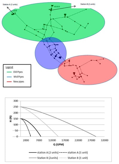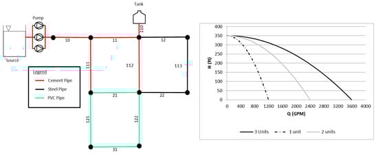 Nonetheless, few changes were made in the network, as depicted in Figure 10. The network was partitioned into three groups of pipes with different values of α and β for every group of pipes (based on the assumption that the calibration of leakage parameters was already done). The chosen values of α and β are shown in Table 3. Furthermore, at both source nodes (with one pumping station each), an additional pumping station was added. Thus, in total, there are four units, with new curves, as described in Figure 10. The demand pattern selected is the same as described in Figure 7, and the other properties of the network are the same as EPANET example number 3.