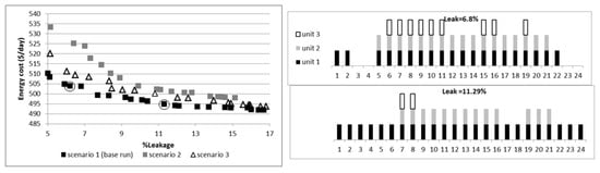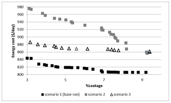 Two sensitivity analyses are presented for this example along with the base run. The first is the same as presented for net 1-c (different electricity tariffs). The results obtained are presented in Figure 11 having around 15 individuals at the non-dominated Pareto front for each of the scenarios. Similar to the earlier case, an inverse relationship was obtained between energy cost of pumping and the leakage in the network. However, in comparison with Figure 9, the variation between the energy cost and leakage was observed to cease at a relatively smaller leakage rate itself. This could be presumed to the varying network characteristics of the two systems selected for the analysis here.
