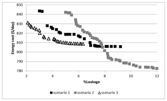 Another sensitivity analysis has been examined for different values of α (see Table 4; β remains as described in Table 3), and presented in Figure 12. It should be mentioned that for many values of α, it was impossible to obtain feasible solutions (the main reason is forbidden negative pressure as defined in Equation (11)). It found that the solution is very sensitive for changing α (Figure 12, having about 30 solutions for each of the scenarios at the non-dominated Pareto front), and in some cases, specific values of α reflected situations that the two objective functions are not competing with each other (as described in the Introduction Section as a possibility). Hence, only values of α that created feasible solutions and Pareto front are presented.