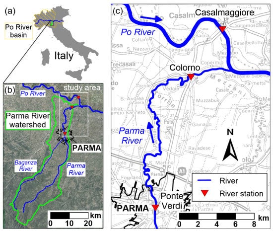 Overview of the study area: (a) locations of the Po and Parma basins in Italy; (b) location of the study area (white) in the Parma River watershed (green), with identification of the rivers (blue) and of the town of Parma (black); (c) sketch of the study area and of the river stations considered in this work.