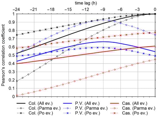 Correlation coefficients between the current water stage at Colorno and the preceding water stage at Ponte Verdi, Casalmaggiore, and Colorno stations.