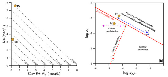 To describe the geochemical processes that occur in the studied deep aquifers, the activity diagram of Ca2+ vs. F− [3] is reported in Figure 3b. Moreover, the saturation indices plot of calcite and fluorite were calculated by the code PhreeqC Interactive, version 3.1.1 [38,39]. In the diagram, the fluorite solubility line and three possible evolution trends (lines a, b, and c) are reported. During fluorite dissolution, the activities of F− and Ca2+ change according to the relationship described by line (a). The field on the right side of line (a) represents the dissolution of other F- and Ca-bearing minerals which can constitute granitic rock. The Pc sample is equilibrated with fluorite and is saturated with calcite. It appears shifted to the left along the saturation line of fluorite, following the path described by line (b) (Figure 3b). F and Ca are probably mainly controlled by calcite precipitation and the concurrent dissolution of fluorite (and subordinately, other F-bearing minerals) until the attainment of saturation with fluorite. The Bg sample falls under the fluorite solubility line, following the trend described by line (c). Indeed, it is unsaturated with respect to fluorite, and it appears to be saturated with respect to calcite. The calcite precipitation could be the main cause of the shift left of sample in the plot, although the cation exchange process between Ca and Na ions could also occur in the studied environment [3,7,45,46]. Although a properly geochemical modeling and/or experimental dissolution studies are needed to define each environmental condition of the rock-to-water release of fluoride [47,48], the diagram pointed out that in a deep environment, several processes causing the F-enrichment of groundwaters could occur.