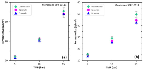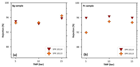Figure 4a,b illustrate the trends of the permeate fluxes as functions of the trans-membrane pressures (TMPs) for the investigated membranes and the two groundwaters (samples Pc and Bg). The figures also report the results obtained with distilled water. Generally, the permeate fluxes increased with the increase of the applied pressure in each performed test. The highest distilled water fluxes were recorded for the SPR 10113 membrane, with values ranging between 24 and 71 L/hm2 at 5 and 15 bar, respectively. Instead, flux values in the range of 15–50 L/hm2 were measured using the SPR 10114 membrane. After the tests performed using distilled water, the permeate fluxes were also determined by testing the Bg and Pc samples. The obtained values were slightly lower than the previous ones, most likely due to the presence of other species in the Bg and Pc samples, which could lead to the concentration polarization phenomena. However, the SPR 10113 membrane always exhibited higher permeate flux values (from 23 to 68 L/hm2, considering both the Bg and Pc samples) compared to those of the SPR 10114 membrane (from 14 to 45 L/hm2, considering both the Bg and Pc samples). This result seems to be in contrast with the MWCO range of the SPR 10113 membrane, which is lower, although quite close to the MWCO range of the SPR 10 114 membrane (see Table 1).