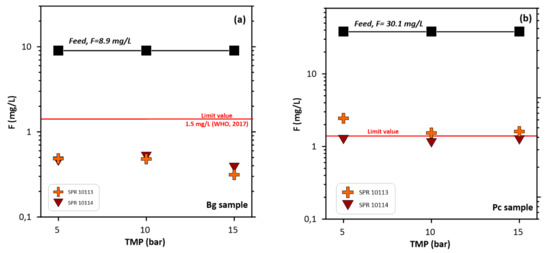 Complete geochemical characterization is useful for the proper choice of the materials and operating conditions to be applied in the subsequent membrane treatment. The compatibility check among the feed water and selected membranes is the first condition to be satisfied. For instance, the alkaline pH of both of the water samples is compatible with the pH operating range of the selected membranes. The membrane MWCO values also need to be appropriate in order to preserve an adequate ionic load in the permeate solutions after treatment, considering the starting average ionic load of both samples (299 mg/L and 587 mg/L, for Bg and Pc respectively). The selected membranes were used to treat, at parity of the operating parameters, the waters with different F-concentrations in order to evaluate the achievable permeate chemical compositions.