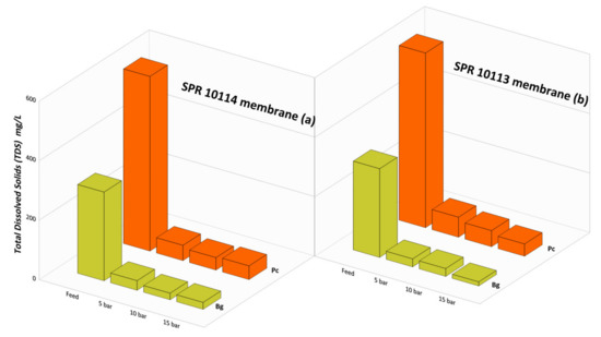 During the NF treatments, the main cations and anions (Na+, K+, Mg2+, Ca2+, F−, Cl−, and SO42−) are rejected differently. Generally, divalent ions are rejected more than monovalent ions. It should be noted that in the considered waters, the monovalent ions prevail with respect to the divalent ones (see Table 2). Indeed, the concentrations of Ca and Mg are very low in both samples, whereas SO4 is the most abundant bivalent ion. The main monovalent ions, in addition to fluoride, are Na+ and HCO3−. The rejections of SO4 reached 99% by using both the SPR 10113 and SPR 10114 membranes. The data obtained by using the SPR 10114 membrane showed rejections ranging from 91% to 95% and from 88% to 92% for the Na and HCO3 ions, respectively. For the same ions, the rejection percentage was similar when the 10113 membrane was used. Indeed, the obtained data showed rejections ranging from 88% to 96% and from 88% to 95% for the Na and HCO3 ions, respectively. Figure 7 shows the total dissolved solid (TDS) content in the permeates (mg/L) produced by the SPR 10113 and SPR 10114 membranes at different TMPs, considering the two tested samples, Bg and Pc.