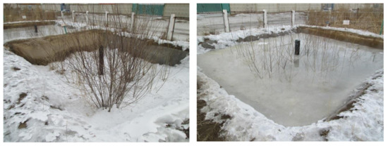 Municipal wastewater was treated at the pre-treatment tank (8 m2) and pumped to the beds. Both beds had an effective depth of a 1 m local sandy loam soil and a spare space of 1 m on top for winter ice accumulation. The surface area of the beds was 15.75 m2. The beds were equipped with a simple surface irrigation pipe (25 mm), and drainage pipework (100 mm) at the bottom of the soil layer. To enable the ice accumulation on the beds, the irrigation pipe stood out approximately 1.1 m over the soil surface (Figure 3). The beds were fed with primary treated wastewater via a pump controlled by a timer with a load of 15 mm·day−1. One bed (A) was loaded only during summertime (from mid-May through mid-September), thus representing option A “external winter storage”, while the other bed (B) was irrigated throughout the year and thus represented option B “internal winter storage”. The bed B with internal winter storage accumulated ice during winter, which was followed by a peak in drainage water caused by ice melt (Figure 4).