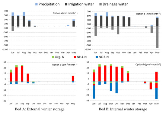 In terms of ammonium nitrogen, both beds showed high rates of nitrification. The lowest NH4-N removal was around 85% for bed B (Table 2). In this bed, 100% of the ammonium associated with drainage water was found during the ice melt period in springtime (April-June) (Figure 6). The nitrate nitrogen found in drainage water was much higher for bed B compared to bed A (Figure 5). This can be attributed to the ice melt and the high amount of drainage water from the bed with internal winter storage. The TN, NH4-N, and NO3-N peaks in April and May were as high as 38%, 90%, and 30% of the total amount in drainage water in the second year for the bed B, respectively.