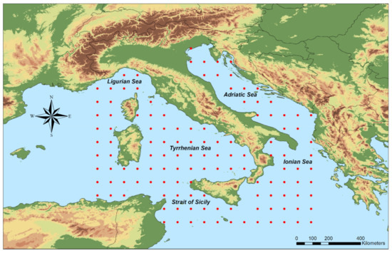 Here, the wave parameters Hs and Te were deduced from the global atmospheric reanalysis ERA-Interim by the European Center for Medium-Range Weather Forecasts (ECMWF). The considered time window refers to the period 1979–2018, while the spatial resolution of the wave nodes is 0.75° × 0.75° and the time sampling between two successive wave data is 6 h. Figure 1 shows the used 129 wave nodes along the Italian seas and the name of the main marginal seas. The adopted ECMWF grid points are located at water depths d ranging from 17.7 to 4098.3 m.