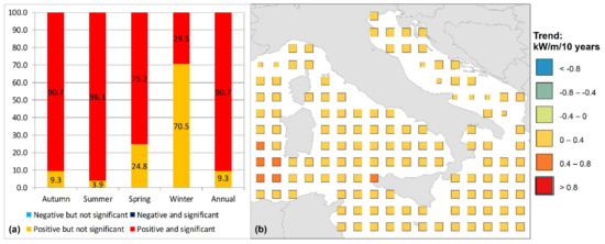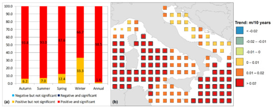 When the seasonal analysis is considered, the percentage of wave nodes showing a significant trend is quite variable (Figure 6a). In fact, significant positive trends associated to winter, spring, summer, and autumn appeared, respectively, in 29.5, 75.2, 96.1, and 90.7% of the grid points. While the winter season is characterized by a large percentage of positive trends but not significant, summer and autumn are distinguished by a percentage of positive trends but not significant, which is comparable with that observed during the year.
