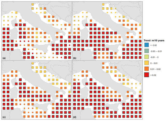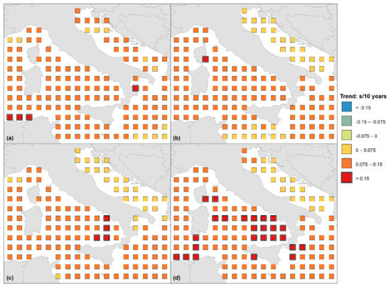 In winter (Figure 5a), positive trends of Te greater than 0.15 s/10 years were highlighted by a thicker square. They were detected along the Algerian coast, with a maximum value equal to 0.17 s/10 years, and for just one node in the Ionian Sea near the Calabrian coast. As observed during the mean year, positive trends of Te oscillating between 0.075 and 0.15 s/10 years cover almost the entire investigated area. Positive trends ranging from 0 to 0.075 s/10 years were instead individuated in some areas belonging to the Ionian, Ligurian, and Adriatic Seas. The spring season was characterized by one grid point having a positive trend of Te larger than 0.15 s/10 years and placed in the northern zone of the Tyrrhenian Sea (Figure 5b). As in winter and during the year, positive trends of Te in the range 0.075–0.15 s/10 years were observed in the Ligurian, Ionian, and Tyrrhenian Seas and in the Strait of Sicily. Positive trends of Te with the smallest magnitude were detected in some parts of the Ionian Sea and in the whole Adriatic basin. During summer (Figure 5c), positive trends of Te greater than 0.15 s/10 years were underlined by a thicker square and concentrated in the eastern area of the Tyrrhenian Sea, as appearing during the year, with a maximum value equal to 0.17 s/10 years. Concerning the positive trends of Te in the range 0.075–0.15 s/10 years, their occurrence is substantially the same of that individuated during the annual analysis. Positive trends of Te ranging from 0 to 0.075 s/10 years were detected in the northern part of the Ionian Sea and along the Adriatic and Ligurian Seas. Regarding autumn, positive trends of Te larger than 0.15 s/10 years were highlighted through a ticker square and mainly detected in the eastern part of the Tyrrhenian Sea, as occurring during the year and the summer, with a peak value of 0.17 s/10 years (Figure 5d). For the positive trends of Te in the range 0.075–0.15 s/10 years, the same spatial concentration occurred as for the previous seasons and during the year. Positive trends of Te in the range 0–0.075 s/10 years were concentrated in the Adriatic Sea.