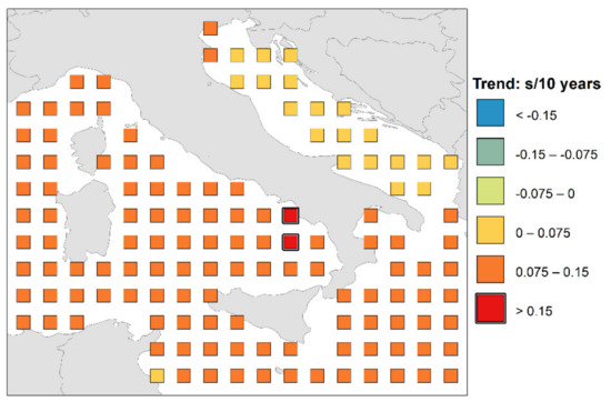 Figure 4 highlights the spatial distribution of the trends for the annual mean Te values along the Italian seas. Only significant positive trends having various magnitudes occur in the whole analyzed area. Positive trends of Te larger than 0.15 s/10 years were highlighted by a thicker square and concentrated in the eastern zone of the Tyrrhenian Sea with a peak value equal to 0.16 s/10 years. Positive trends of Te in the range 0.075–0.15 s/10 years were detected in the majority of the Italian seas and, specifically, along the Ligurian and Ionian Seas, the Strait of Sicily and in the central-western area of the Tyrrhenian Sea. The greatest increment in this range was detected near the Algerian coast. Positive trends of Te oscillating between 0 and 0.075 s/10 years were mainly observed along the Adriatic Sea.