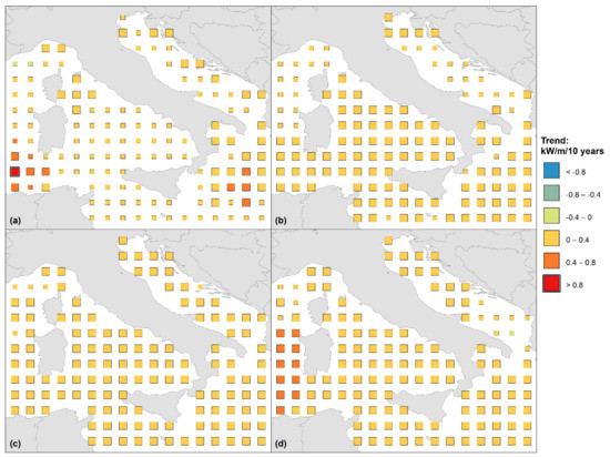 Figure 6b illustrates the spatial distribution of the trends for the annual mean P values along the Italian seas. It can be observed that the major part of the involved grid points showed a positive trend with values oscillating between 0 and 0.4 kW/m/10 years. As underlined by the use of a thicker square, just four wave nodes located between Sardinia and Algeria presented a positive trend with values ranging from 0.4 to 0.8 kW/m/10 years, where the peak value is approximately equal to 0.5 kW/m/10 years.