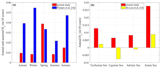(a) Annual and seasonal trend of the mean Hs values: comparison between present results and those obtained by Pomaro et al. [16]; (b) Annual trend of the mean Hs values: comparison between present results and those obtained by De Leo et al. [18].