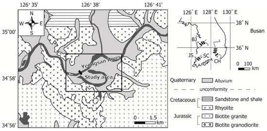 Location and geological map of the study area near the Juksan weir (JS) in the Yeongsan River Basin, South Korea (modified from [26]).