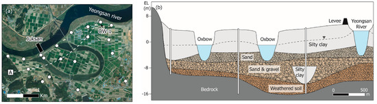 The study area is a 6.4 km2 alluvial aquifer, located on the left bank of the Yeongsan River near the Juksan weir, South Korea (34°57′33″–34°58′59″ N, 126°36′50″–126°39′23″ E) (Figure 1). The Yeongsan River flows in a meandering pattern from east to west in the northern part of the study area. The western part of the study area is characterized by hilly terrain, with an oxbow lake located in the center of the study area. The oxbow lake was created during a river straightening project (conducted in 1980) that cut off the left-bank meander [25]. The width of the Yeongsan River varies from 150 to 370 m, and the width of the oxbow lake varies from 100 to 220 m. Juksan weir is located near the downstream confluence of the oxbow lake. A hydroelectric power plant was installed at the upstream confluence of the oxbow lake during the construction of the Juksan weir in 2012. The oxbow lake drains into the Yeongsan River via the downstream confluence. The bedrock in this region consists predominantly of biotite granites. Quaternary alluvium that was deposited in a fluvial environment unconformably overlies the bedrock and is distributed along the Yeongsan River and the oxbow lake. The alluvium is composed of clay, sand, and gravel characterized by fining-upward sequences. It is therefore a confined aquifer. The surface elevation in the study area ranges from 3.3 m to 4.9 m.