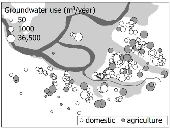 Figure 3 shows the groundwater use in the study area. The study area is characterized by agricultural fields that cultivate barley and rice. Barley and rice are cultivated during the summer and are irrigated with water from the river, not groundwater. Groundwater is mostly used for domestic and agricultural purposes in the bedrock of the hinterland. The groundwater pumping rates for each well vary from 140 to 36,500 m3/year for domestic and from 180 to 24,300 m3/year for agriculture purposes.
