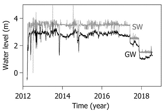 Figure 2b shows the sedimentary structures in the alluvial deposits along transect A with the groundwater level observed in May 2018. Columnar sections at three monitoring well sites were used to analyze the distribution of the sedimentary layers. The alluvial deposits are characterized by fining-upward sequences. The upper and middle alluvial materials consist of silty clays and sand with thicknesses of 6.7 and 2.6 m, respectively. The lower 4.8 m are composed of sand, gravel, and weathered soil. A permeable layer is located in the lower alluvium, where groundwater actively interacts with river water.