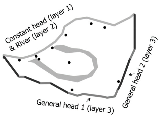 Figure 5 shows the model domain with the selected boundary conditions. We used 430 columns and 300 rows, with grid dimensions of 10 m by 10 m. The aquifer was vertically divided into three layers to reflect the heterogeneity of the fluvial-alluvial deposits [32,33,34]. The upper layer consisted of silty clay, the middle layer consisted of sand, and the lower layer was composed of gravel and weathered soil. Average surface elevations were used for each layer and the groundwater surface elevation was 5 m. The average thicknesses of the upper, middle, and lower layers of the aquifer were 7 m, 4 m, and 5 m, respectively. Each layer was assumed to be isotropic and homogeneous.