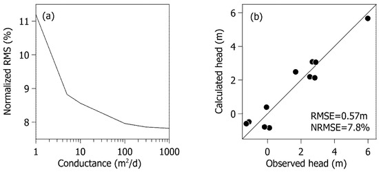 The agreement obtained between the calculated and measured heads after calibration is shown in Figure 6b. The root mean square error (RMSE) and the NRMSE between the observed and calculated heads were 0.57 m and 7.8%, respectively. This indicates an acceptable agreement between the calibrated model and the monitoring data [38].