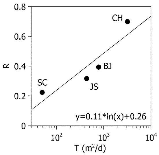 The stream–aquifer interactions are controlled by the hydrogeologic environment, including the geologic characteristics of the aquifer [39]. Groundwater and river water data were used to analyze the impacts of the transmissivity on the groundwater level reaction rate following a change in the river level. The groundwater and river water data were obtained from the Juksan (JS) and Seungchon (SC) weirs in the Yeongsan River, the Beakje (BJ) weir in the Geum River, and the Changnyeong-Haman (CH) weir in the Nakdong River (Figure 1).