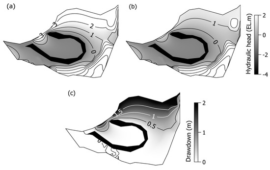 Changes in groundwater level due to water gate operation of Juksan weir (a) when the river level was 3.5 m and (b) 1.5 m, and (c) the drawdown.