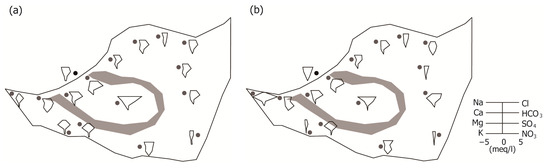 Changes in groundwater flow can affect the groundwater quality [44]. The chemical characteristics of the river water and groundwater were analyzed to determine how their compositions changed using groundwater data collected from 15 monitoring wells [45]. Figure 9 describes the spatial distributions of river water and groundwater quality before (December 2016) and after (November 2017) the weir opening. The river showed Na-HCO3 as the dominant water type according to the classification of Piper [46]. In contrast, groundwater showed various water types: Na-Cl, Ca-HCO3, and Na-HCO3 types. However, in the area upstream of the weir (except inside the oxbow lake), the groundwater quality was homogenized because large volumes of river water flowed into the aquifer following the weir construction in 2012 (Figure 9a). The groundwater quality was the Na-HCO3 type in this area, which is similar to the river water. After the decrease in induced recharge due to the opening of the weir, the groundwater quality in the area upstream of the weir changed, exhibiting various types (Ca-HCO3, Ca-Cl, and Na-Cl) (Figure 9b). On the other hand, there were various types of groundwater quality inside the oxbow lake where the groundwater level was not affected by the weir operation, which was expected to be affected by the geochemical environments and land use [47].