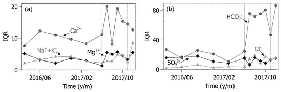 Variations in the interquartile ranges (IQR) of (a) major cations and (b) anions in groundwater in the area upstream of the Juksan weir, except within the oxbow lake.